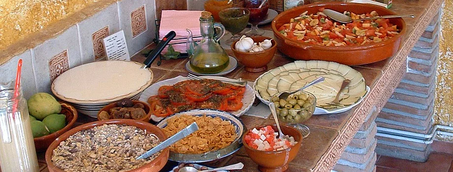Den vegetariske buffeen som serveres to ganger om dagen er variert og smakfull. Frokostbuffeen serveres i etterkant av morgenyogaen og består av et utvalg frukter, mùsli, supergod havregrøt, egg fra egne høner servert på mange måter, brød, spanske oster, syltetøy mm. Middagen serveres i etterkant av ettermiddagsyogaen, har flere deilige retter og dessert. Midt på dagen er det satt fram mat som man har mulighet til å forsyne seg av selv, og det er tilgang til enkle snacks.
